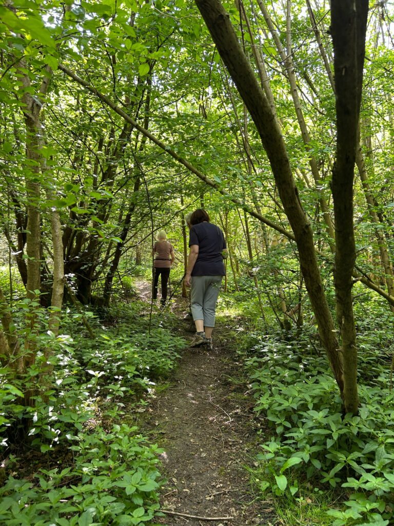 Our circular walk was along country paths, and farmland field edges which were still a little muddy in places. There was a short path through woodland where the bluebells were out and some navigable slopes and footbridges.